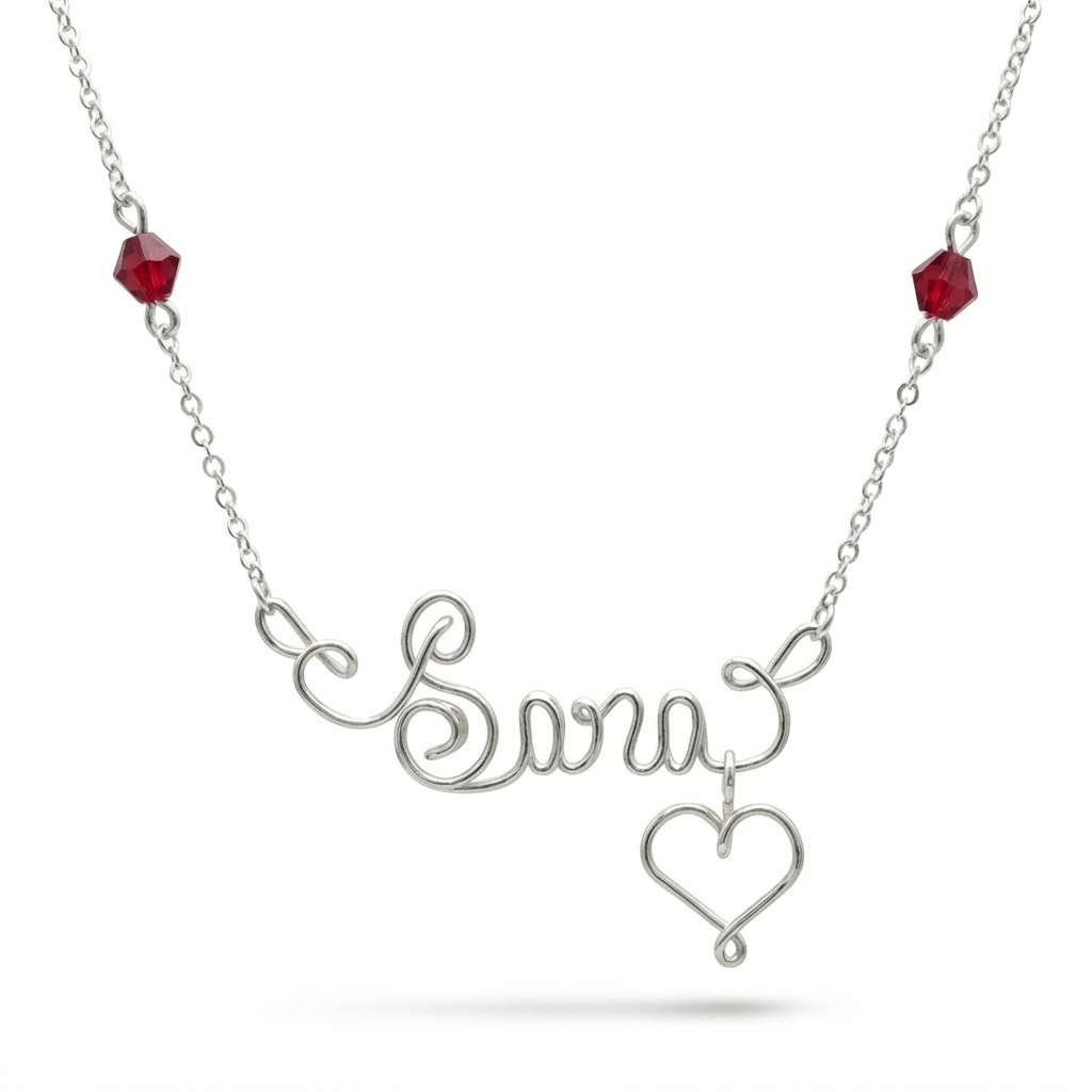 * Customize your name with 925 Silver round wire necklace with non removable chain, customized piece with hanging love heart at end of the name with two swarovski available on chain only, as per image