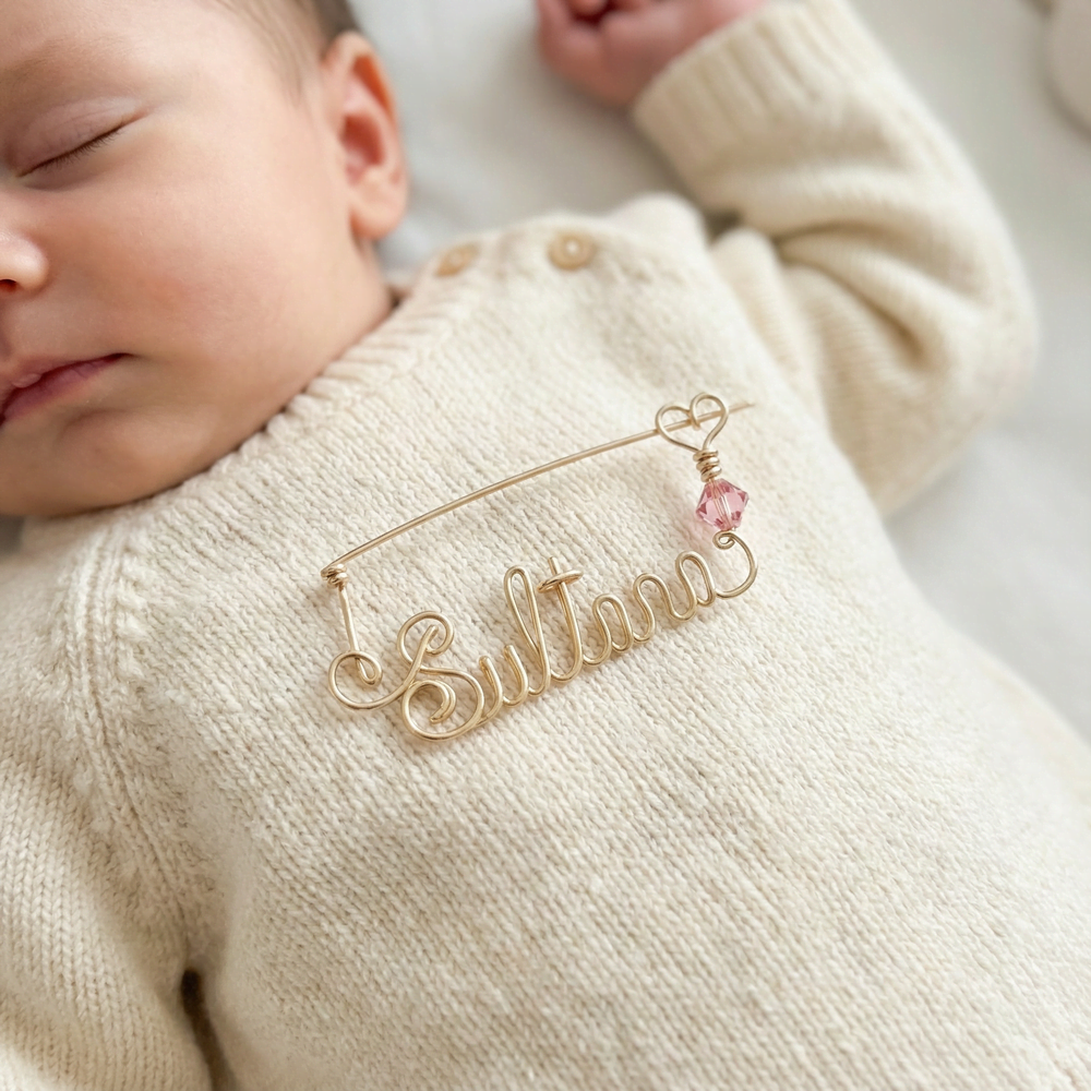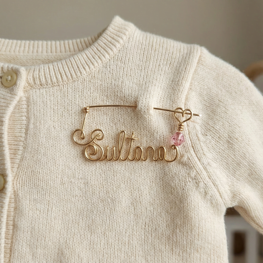 * Customize your name with 14 Kt Gold Filled brooch round wire customized piece with one swarovski and love heart lock
